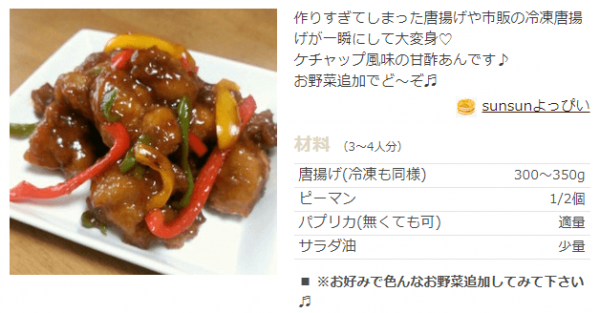 フライパンでピーマンとパプリカを炒め、軽く火が通ったら温めた唐揚げを加えて、さらにタレを一気に加えてとろみがついたら完成です。