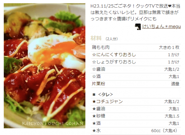 丼にご飯をよそって野菜・タレを絡めた唐揚げ・温泉卵・マヨネーズをトッピングして出来上がり。