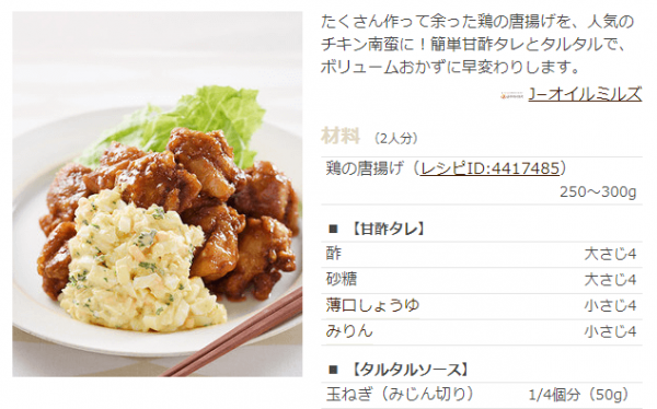 耐熱容器に酢・砂糖・醤油・みりんを入れてレンジで加熱し、温めた唐揚げを絡めて器に盛り、タルタルソースをかけるだけ。